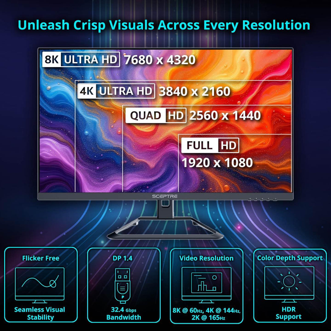 High-Speed DP 1.4 Compatibility: Supports resolutions up to 8K at 60Hz, ensuring ultra-clear visuals for top-tier gaming and content creation. Smooth Refresh Rates: Delivers fluid performance with support for 4K at 144Hz...