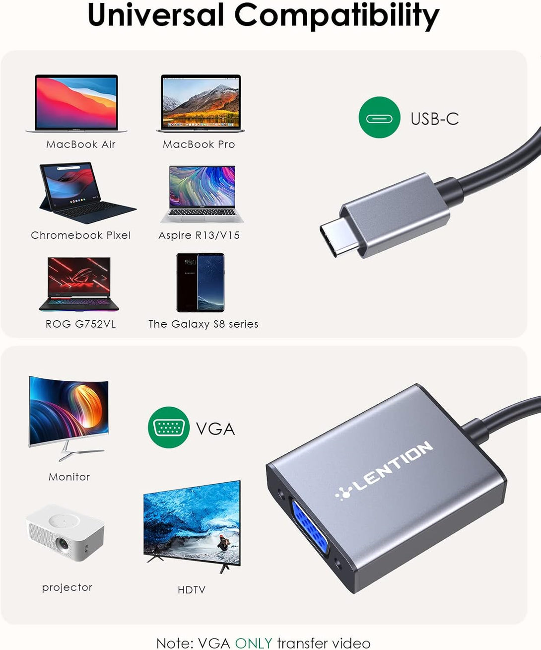 Enjoy Full HD Output: The LENTION USB-C to VGA adapter supports resolutions up to 1920x1200@60Hz, downward compatible with 800x600, 1024x768, 1280x768, 1280x800, 1280x960, 1280x1024, 1440x900, 1600x1200, 1680x1050, 1920x1080. (Note: VGA does NOT transmit audio, ONLY supports video)