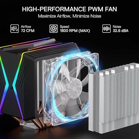 Geared with 120mm RGB fans with PWM, features powerful (700-1800 RPM) fan speed and max 72CFM (ft3/min) airflow. PWM control highly matches system needs, for high performance in low noise.