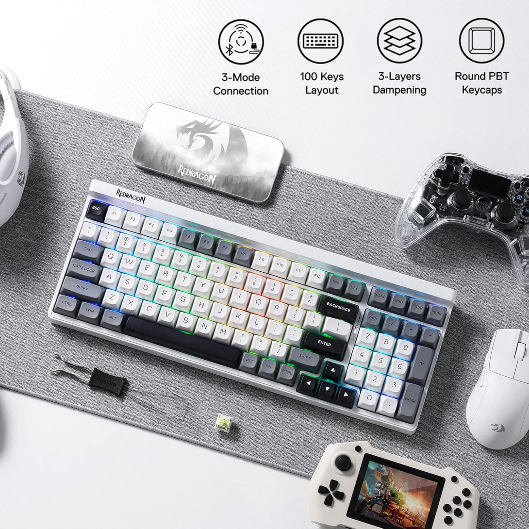 3-Mode Connection - Geared with Redragon advanced tri-mode connection technology, USB-C wired, BT 3.0/5.0 & 2.4Ghz wireless modes which make the user experience upgraded to another level in all fields. 100 Keys...