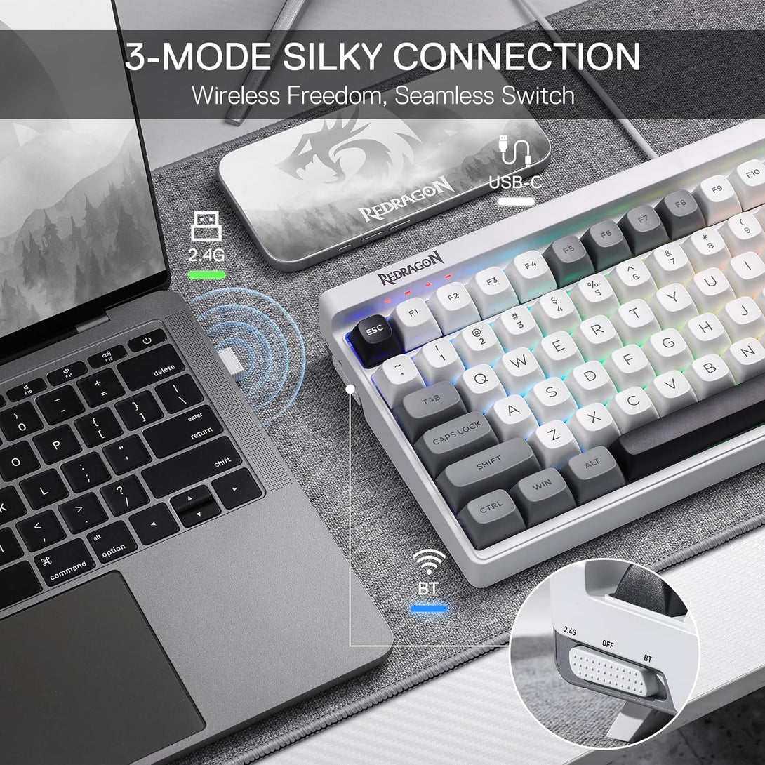 3-Mode Connection - Geared with Redragon advanced tri-mode connection technology, USB-C wired, BT 3.0/5.0 & 2.4Ghz wireless modes which make the user experience upgraded to another level in all fields.