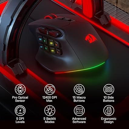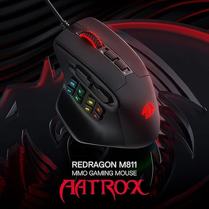 Redragon M811 Aatrox MMO Gaming Mouse, 15 Programmable Buttons Wired RGB Mouse w/Ergonomic Natural Grip Build, 10 Side Macro Keys, Software Supports DIY Keybinds & Backlit